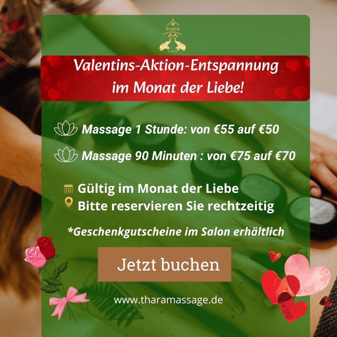 Bei Thara Thai Massage genießen Sie traditionelle thailändische Massagetechniken, die Körper und Geist ins Gleichgewicht bringen. Unsere Behandlungen lösen Verspannungen, fördern die Durchblutung und schenken Ihnen ein Gefühl tiefer Ruhe und Erholung.